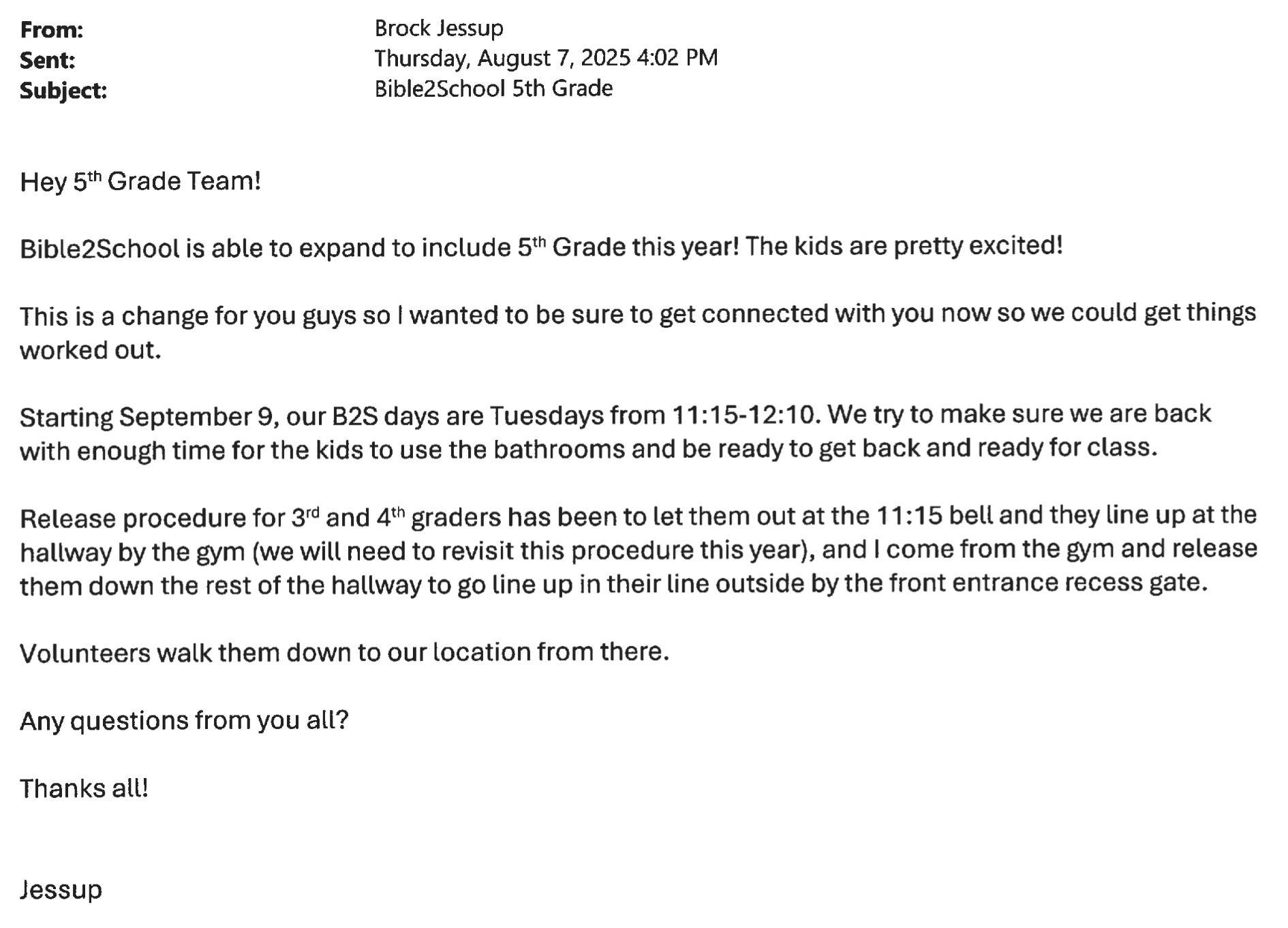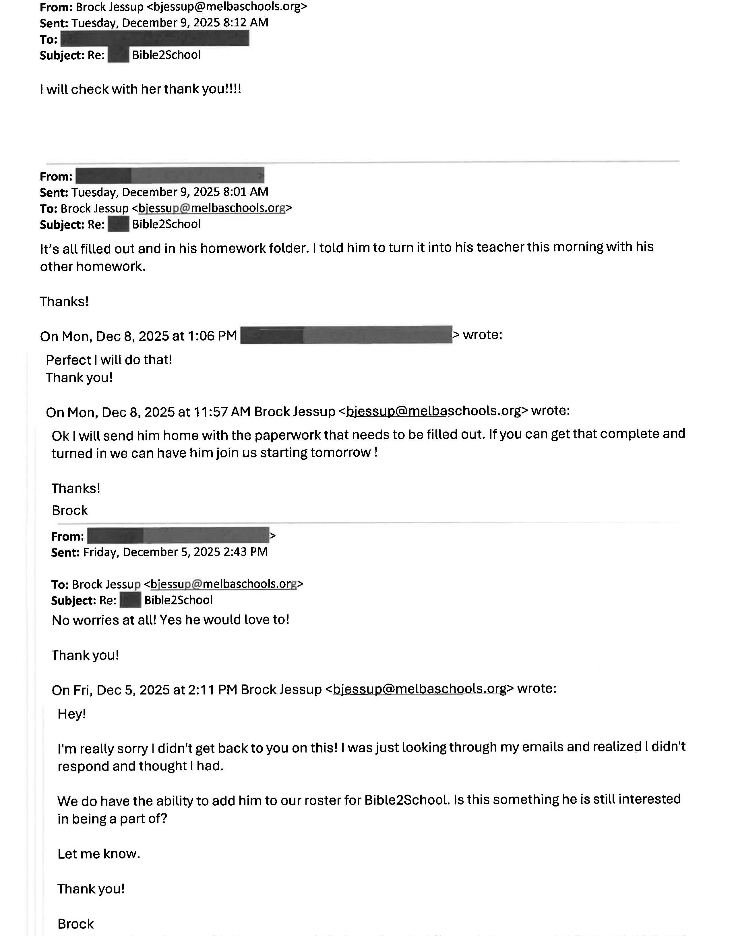 The physical education teacher at Melba Elementary School, Brock Jessup, organized the effort to introduce the RTRI program at his school. This action violates both school policy and Idaho state law. Jessup managed the sign-up process through school communications, sending and receiving sign-up forms on school property. The emails below demonstrate how this process was handled at the school.