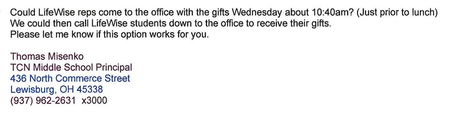 The Lifewise Academy Tri-County North teacher, Lilly Hobbs, and program director, Jan Seibel, set up on school property and in the school to hand out Bibles and Lifewise merchandise to students. Then they received visitor badges and walked off into the school.