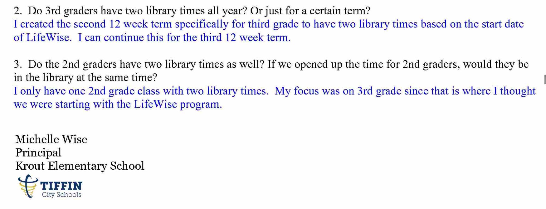 The school is already concerned about having enough time to prepare students as needed, and Lifewise hasn’t even started. The principal informs Lifewise that the schedule had already been modified to support Lifewise by adding a second Library period, so students attending Lifewise will not be behind. This also prompted the Library teacher to question why their planning time was reduced by adding a second third-grade class.