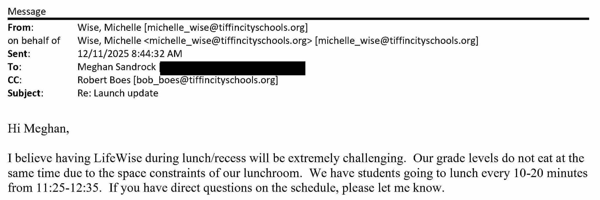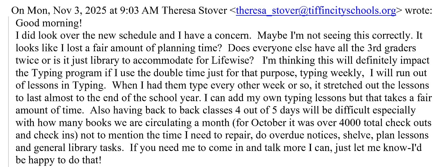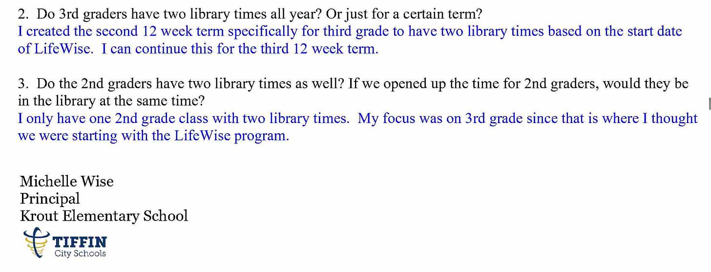 Lifewise plans to operate in every grade at Tiffin City Schools. This issue will only become larger as they push the school for more time. In an email, you can see the Lifewise director already asking about second grade.