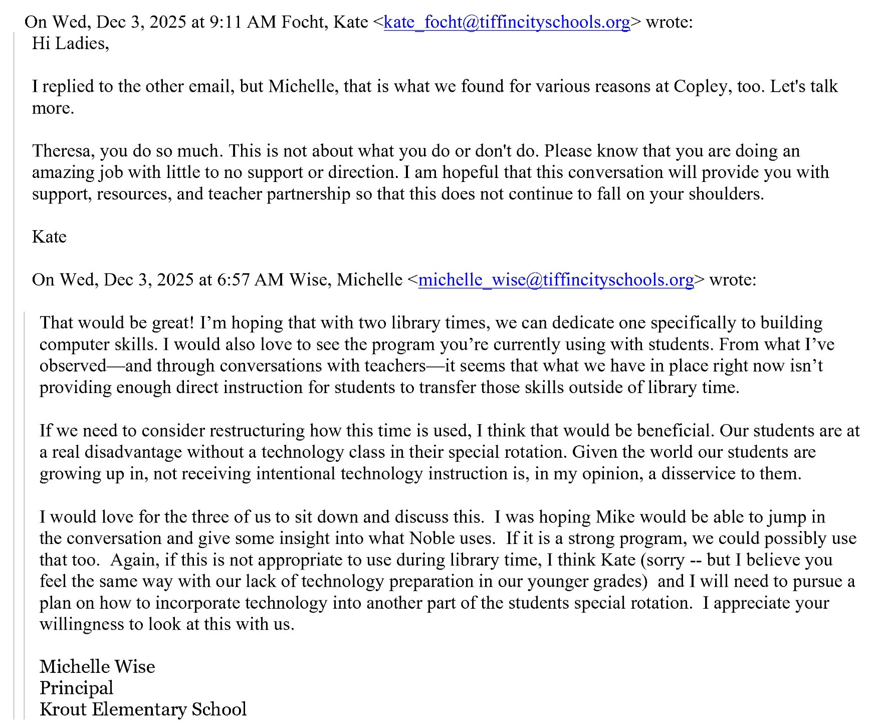 These few emails make it clear that schools are adjusting schedules and practices to accommodate a religious program. Scheduling will always involve compromises, but making a religious program the reason for these changes is wrong. The district also discussed adding more Library and Technology class time, but how does this work with a religious program that requires the school to accommodate it?