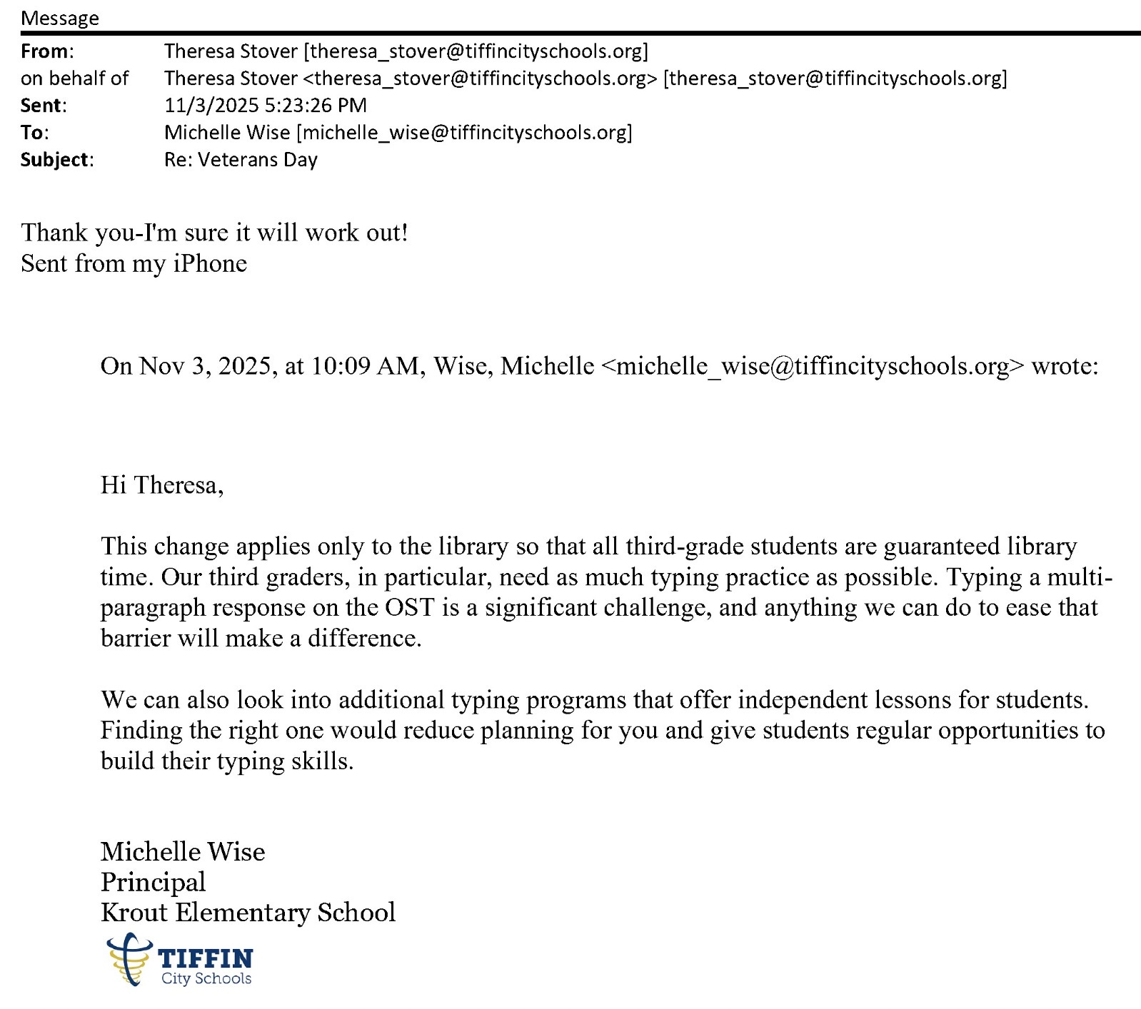 This means the school will have to find a different time. The principal decided to use the “Library” class for this time. The library class supports keyboarding, technology, reading, and other student services. The state test requires students to demonstrate keyboarding skills. Regardless of the state test, the district has also prioritized typing and technology. This is supported by multiple emails obtained through a public records request.