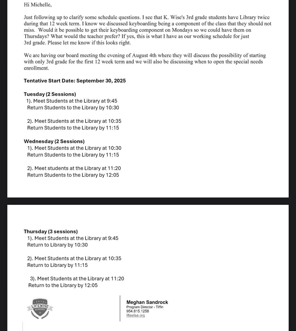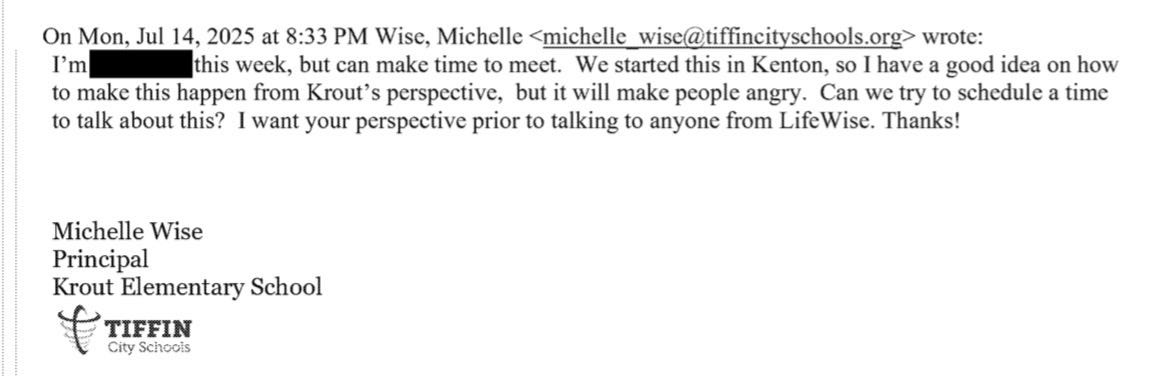 The principal for Krout Elementary in Tiffin, OH, indicated in emails that they “have a good idea” of how to implement Lifewise, but it will make people “angry.” The principal also coordinated with Lifewise to create a schedule, without the support or input of the teacher whose class the students would miss. The Lifewise director shared ideas for how the teacher could shift things to make the schedule work for Lifewise.